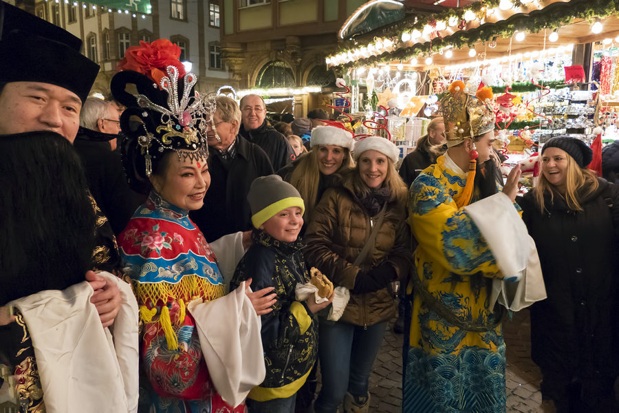 為慶祝2017年春節(jié),德國(guó)法蘭克福華人華僑在市政廳廣場(chǎng)組織了一次快閃,引起了德國(guó)民眾極大興趣。[攝影:方揚(yáng)]