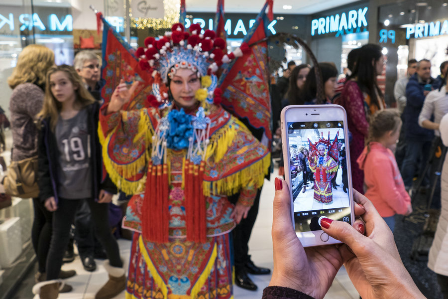為慶祝2017年春節(jié),德國(guó)法蘭克福地區(qū)華人華僑在達(dá)姆市購(gòu)物中心組織了一次快閃。圖為穆桂英亮相。[攝影:方揚(yáng)]