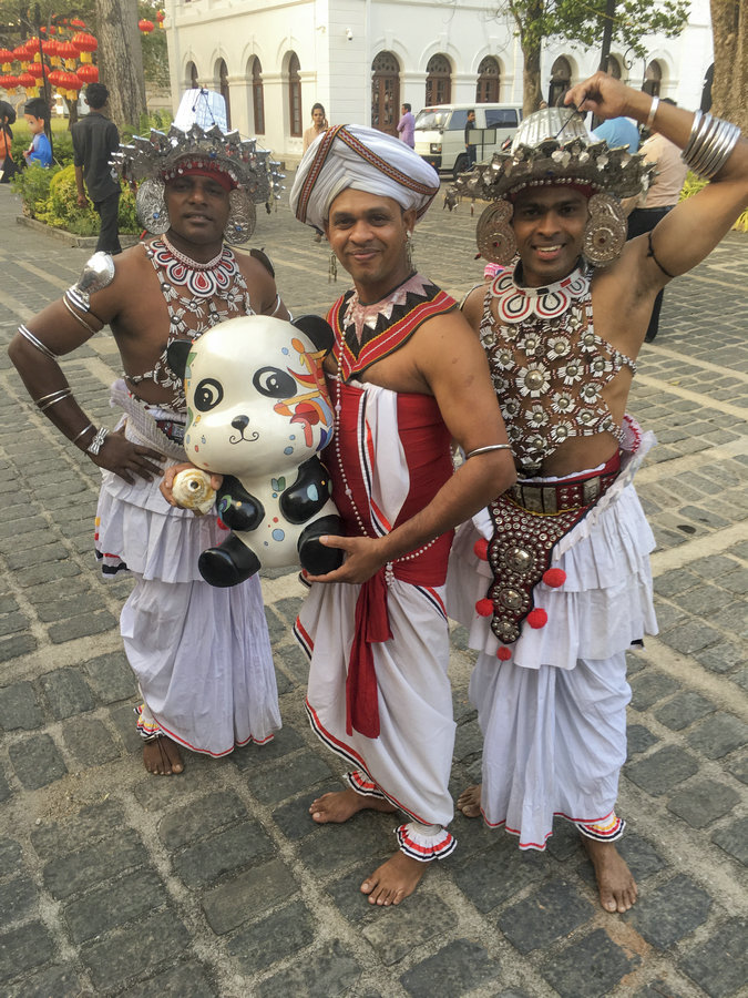 首屆斯里蘭卡“歡樂春節(jié)”元宵燈會在科倫坡獨立廣場舉行。圖為身穿斯里蘭卡民族傳統(tǒng)服裝演員與“不二熊貓”合影。[攝影:李朋]