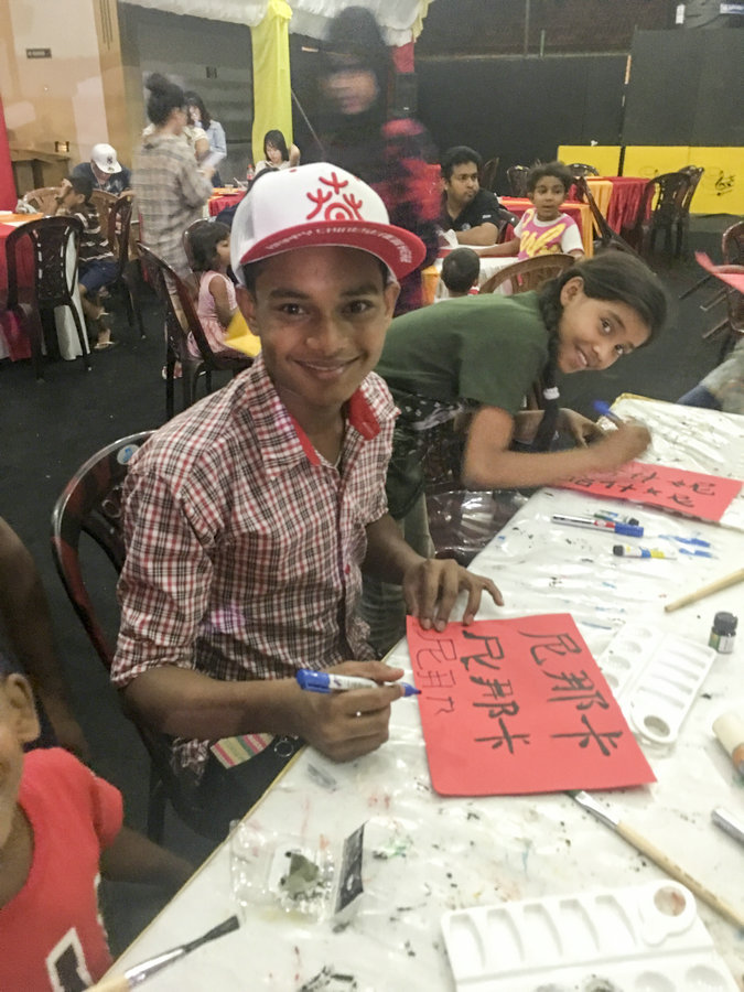 首屆斯里蘭卡“歡樂(lè)春節(jié)”元宵燈會(huì)在科倫坡獨(dú)立廣場(chǎng)舉行。圖為斯里蘭卡少年學(xué)習(xí)中國(guó)漢子。[攝影:李朋]