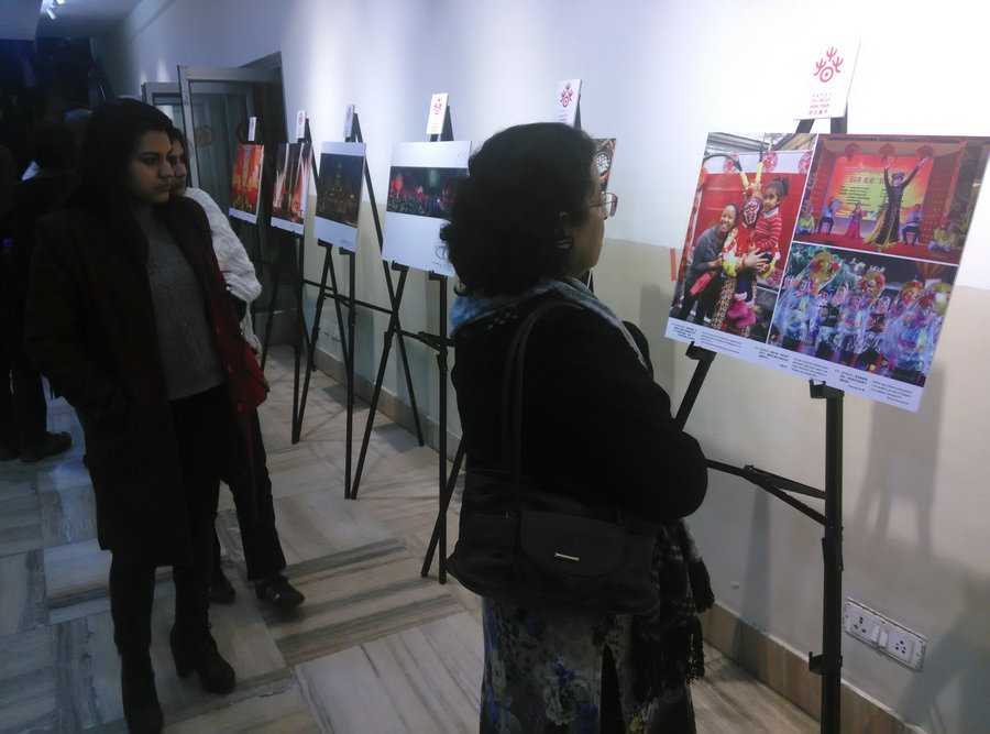 觀眾認真參觀展覽。 2017年1月18日,駐印度使館文化處在印度新德里舉辦“歡樂春節(jié)”圖片展。[攝影:任曉宇]