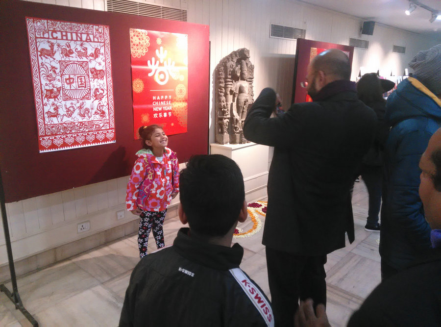 “我與春節(jié)拍個(gè)照” 2017年1月18日,駐印度使館文化處在印度新德里舉辦“歡樂春節(jié)”圖片展。[攝影:任曉宇]