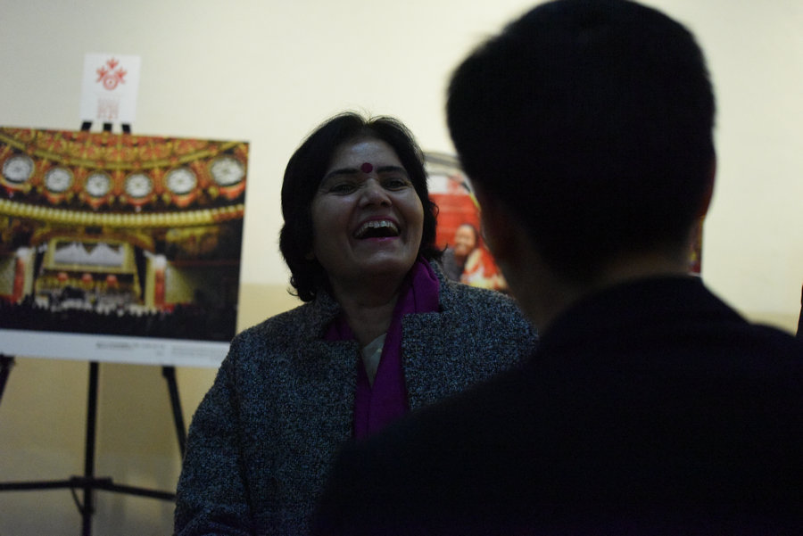 觀眾參觀展覽時(shí)露出開心笑容 2017年1月18日,駐印度使館文化處在印度新德里舉辦“歡樂春節(jié)”圖片展。[攝影:任曉宇]