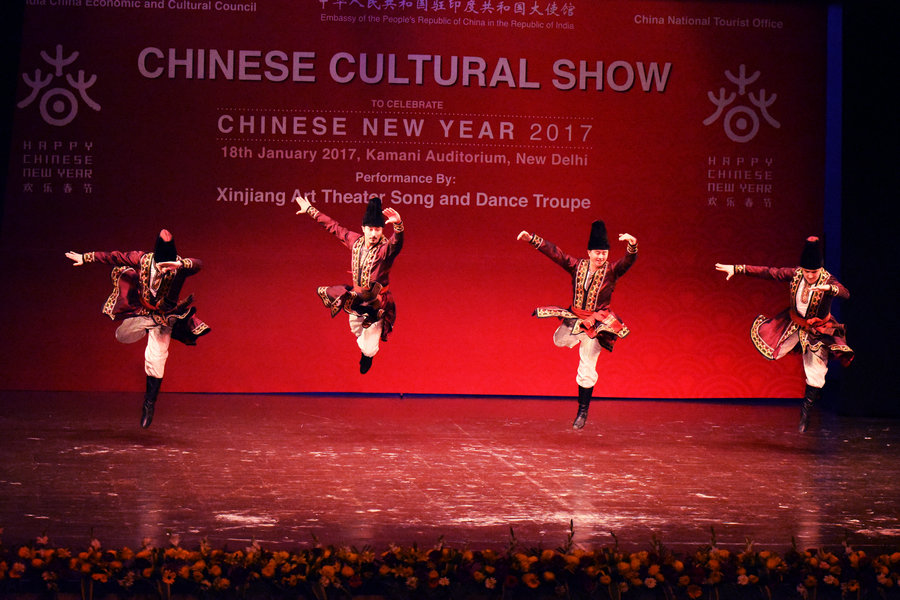 2017年1月18日,新疆藝術(shù)劇院歌舞團(tuán)在印度新德里進(jìn)行“歡樂春節(jié)”專場演出。[攝影:Shashank Kaul]