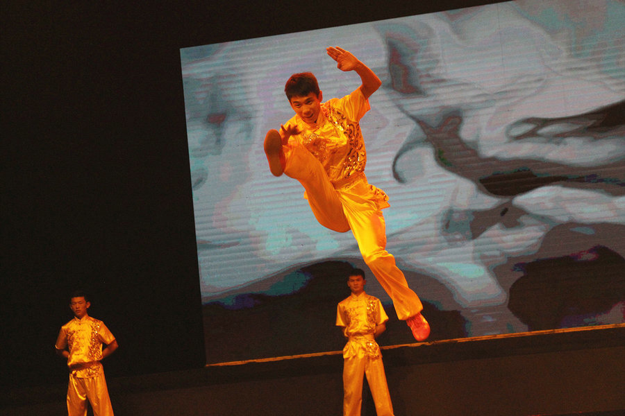 Chinese martial arts masters perform kung fu at a gala to celebrate Chinese New Year in Colombo, Sri Lanka. [Photo by Lester S. Rupasinghe]