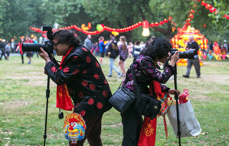 《夫妻觀燈》——新西蘭基督城春節(jié)燈會(huì),當(dāng)?shù)厝A僑夫婦拍攝現(xiàn)場(chǎng)畫面。[攝影:陳建懷]