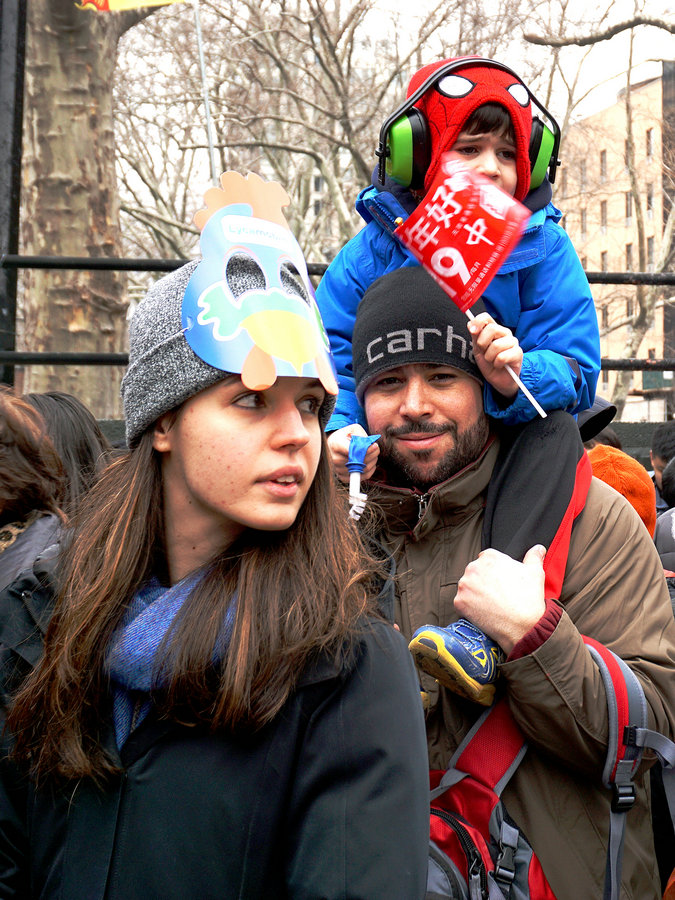 小男孩搖著“新年好”的小旗穿行在紐約華埠新春爆竹嘉年華中。 [攝影:Yan Liang Hu]