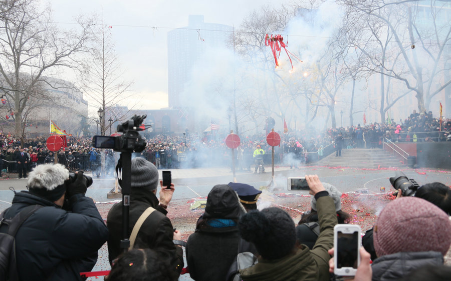 農歷雞年大年初一,紐約唐人街多家社區(qū)機構聯(lián)合組織第十八屆新春爆竹文化節(jié),吸引各族裔民眾數萬人到場觀看。[攝影:管黎明]