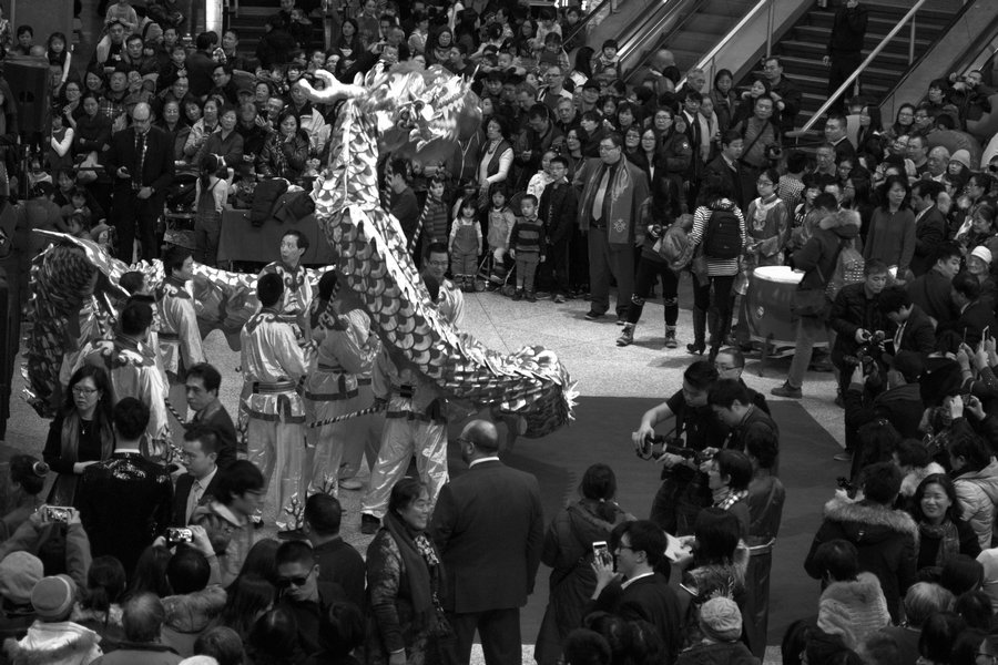 廟會(huì)展場上,舞龍登場,民眾涌入。[攝影:陳世勛]