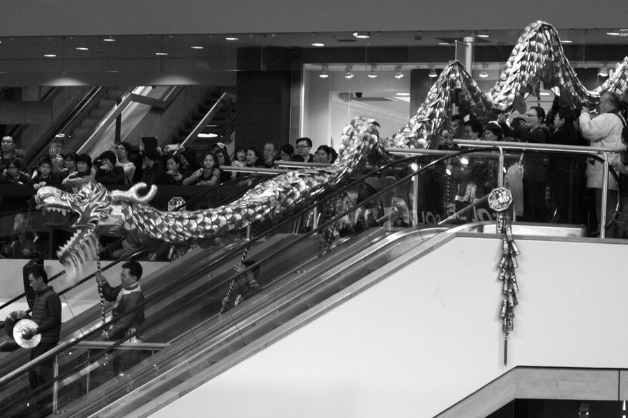 廟會(huì)展場(chǎng)上,舞龍登場(chǎng),民眾涌入。[攝影:陳世勛]