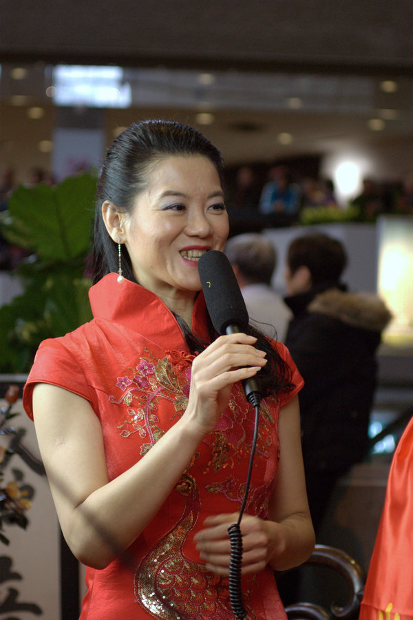 廟會(huì)現(xiàn)場(chǎng)的女主播。[攝影:陳世勛]