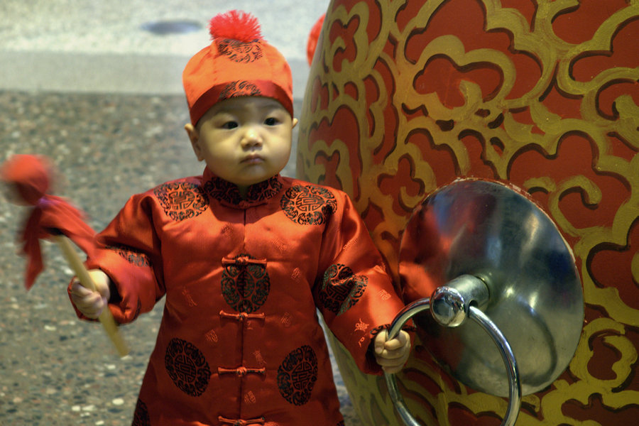 小朋友在廟會展場上把玩大鼓。[攝影:陳世勛]