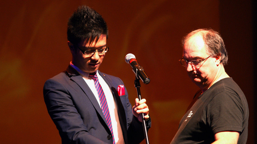 蒙特利爾春晚準(zhǔn)備階段,工作人員檢查麥克風(fēng)。[攝影:陳世勛]