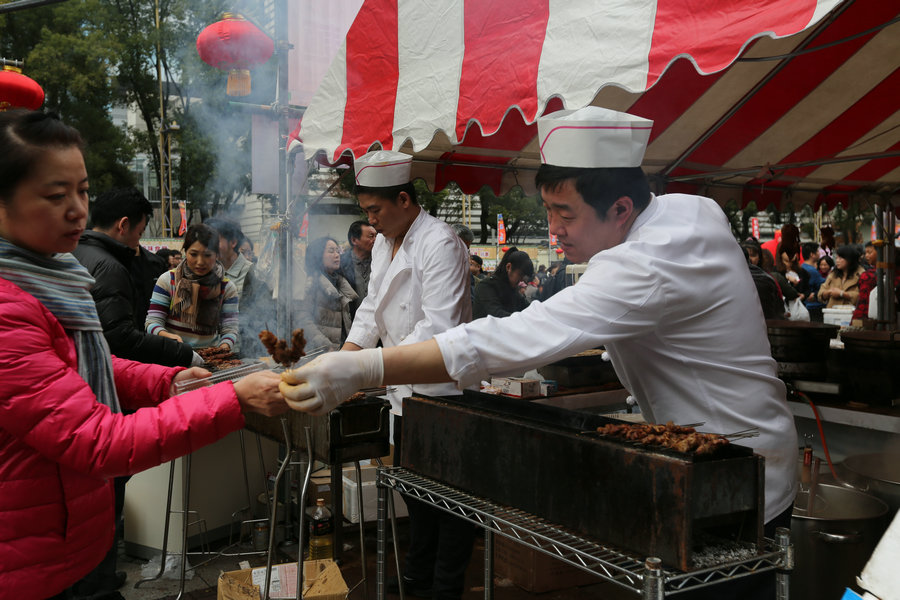 2017年1月9日,第11屆名古屋春節(jié)祭,春節(jié)祭現(xiàn)場(chǎng)日本民眾購(gòu)買中國(guó)傳統(tǒng)食品羊肉串。[攝影:柳龍旭]