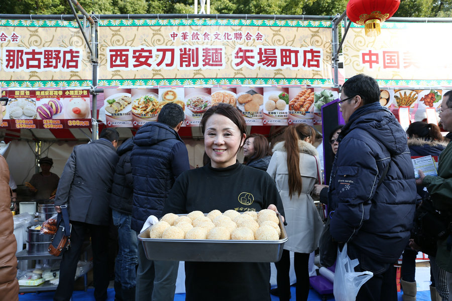 2017年1月7日,第11屆名古屋春節(jié)祭,食品出展鋪位展示剛出爐中國傳統(tǒng)美食——麻團。[攝影:柳龍旭]