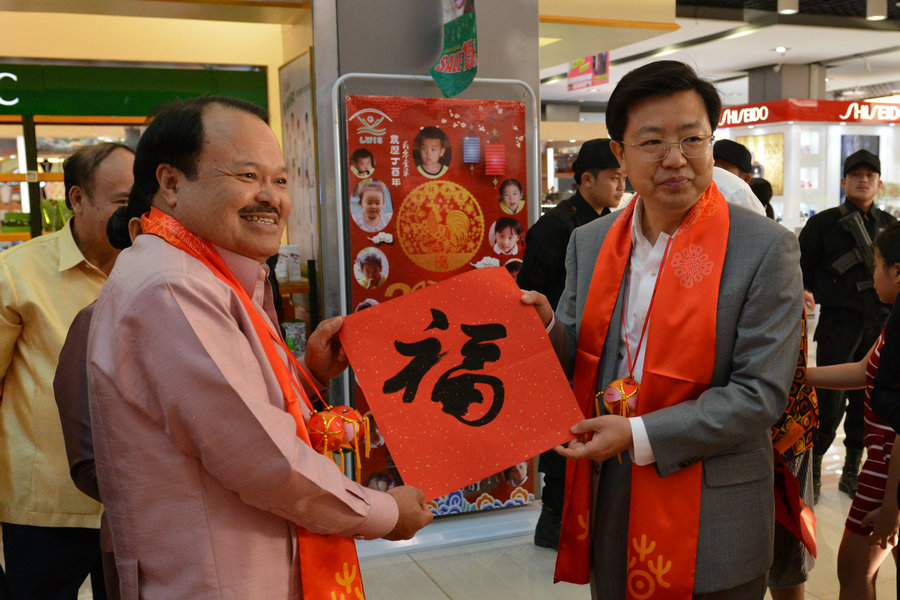 2017年1月,老撾萬象,在“歡樂春節(jié)”廟會上,老撾人民革命黨中央委員、能源礦產(chǎn)部部長、老中友協(xié)主席坎馬尼獲贈“?!弊?。[攝影:李延煊]