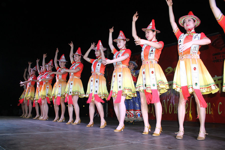 中國(guó)甘肅藝術(shù)團(tuán)在貝寧演出。[攝影:Zounyekpe Coffi Séraphin] Dancers from China's Gansu Art Troupe perform in Adjadi, Tori, Benin. [Photo by Zounyekpe Coffi Séraphin]