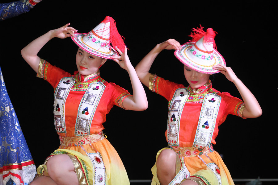 中國(guó)甘肅藝術(shù)團(tuán)在貝寧演出。[攝影:Zounyekpe Coffi Séraphin] Dancers from China's Gansu Art Troupe perform in Adjadi, Tori, Benin. [Photo by Zounyekpe Coffi Séraphin]