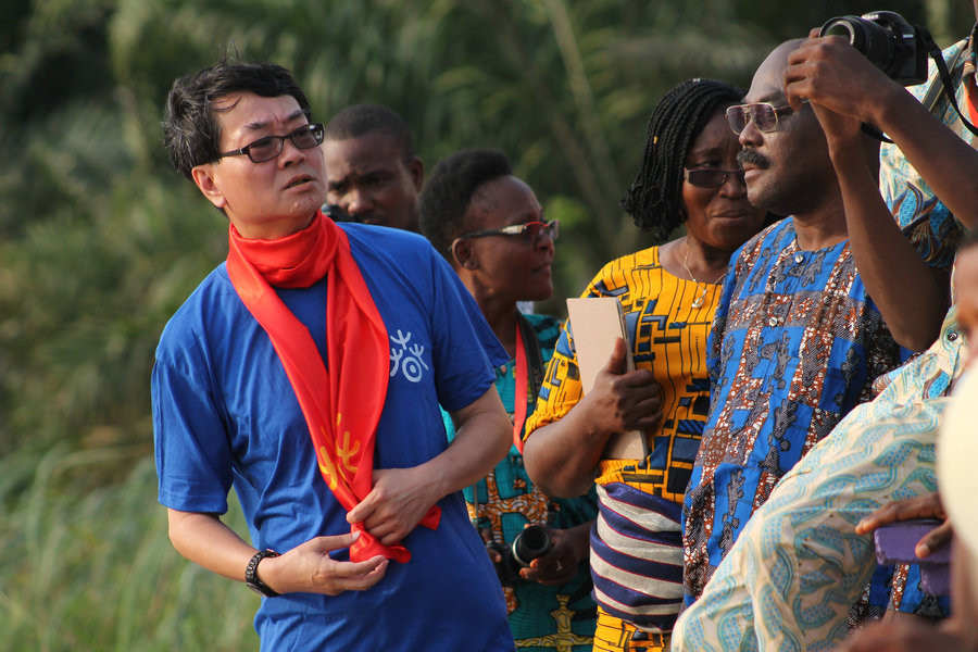 中國駐貝寧大使館文化參贊兼貝寧中國文化中心主任魏軍參加歡樂春節(jié)劃船比賽活動。[攝影:Zounyekpe Coffi Séraphin] Wei Jun, head of the China Cultural Center in Benin, interacts with local people during a boat race contest in Adjadi, Tori, Benin. [Photo by Zounyekpe Coffi Séraphin]