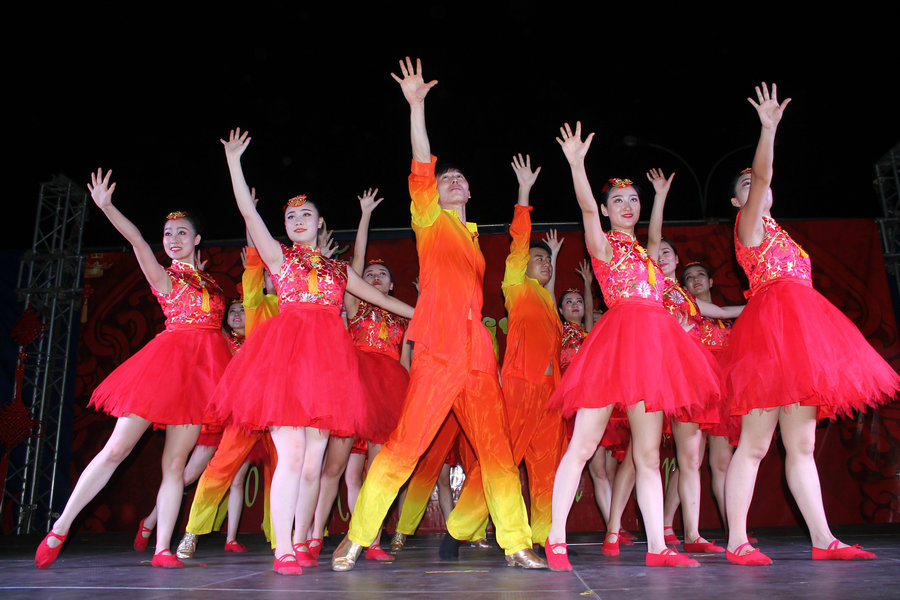 中國甘肅藝術(shù)團(tuán)在貝寧表演。[攝影:Zounyekpe Coffi Séraphin] Dancers from China's Gansu Art Troupe perform in Adjadi, Tori, Benin. [Photo by Zounyekpe Coffi Séraphin]