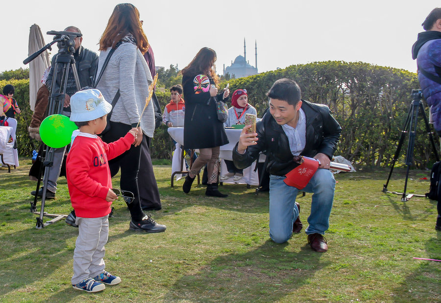 埃及開羅愛資哈爾公園,一位父親為孩子拍照留念。[攝影:Adel Sabry] A father takes a photo of his son at a New Year temple fair at Al-Azhar Park in Cairo, Egypt. [Photo by Adel Sabry]