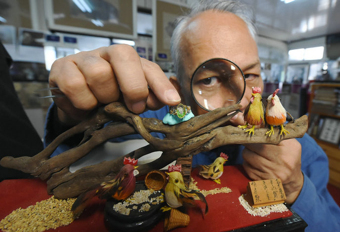 To celebrate the upcoming Year of the Rooster, Chen Fengxian, a miniature engraver from Taiwan, carved an extremely small rooster by 1 millimeter resin material.