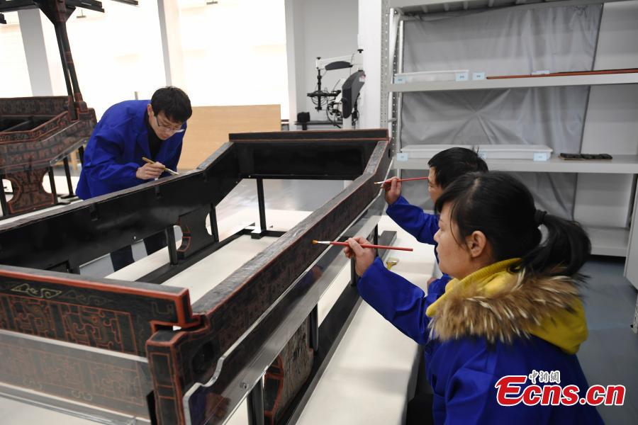A lacquer woodware undergoes restoration work at the Chengdu Cultural Relics and Archeology Research Institute in Chengdu city, the capital of Southwest China’s Sichuan province, Jan 8, 2017. [Photo/China News Service]