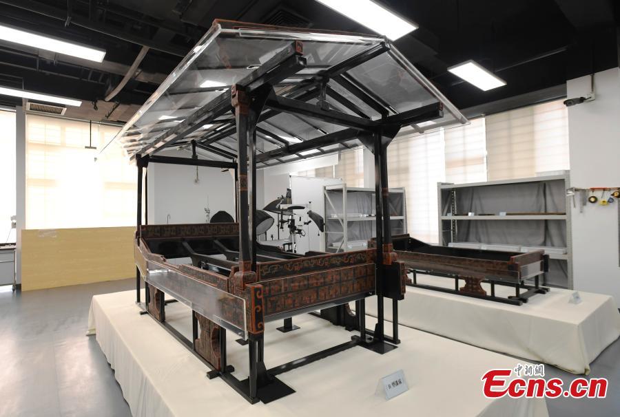 Archeologists show off a restored lacquer wood bed from 2500 years ago at the Chengdu Cultural Relics and Archeology Research Institute in Chengdu city, the capital of Southwest China’s Sichuan province, Jan 8, 2017. [Photo/China News Service]
