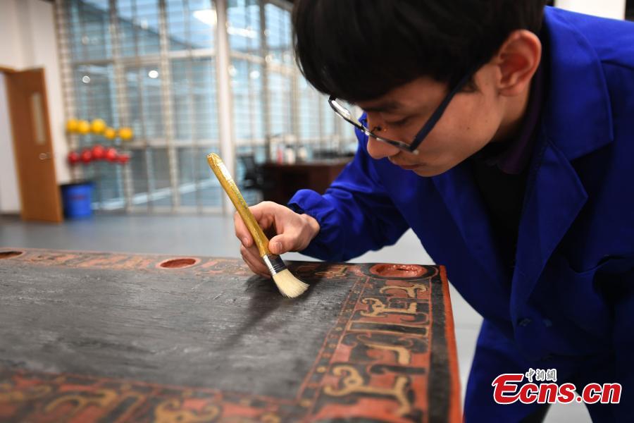 A lacquer woodware undergoes restoration work at the Chengdu Cultural Relics and Archeology Research Institute in Chengdu city, the capital of Southwest China’s Sichuan province, Jan 8, 2017. [Photo/China News Service]