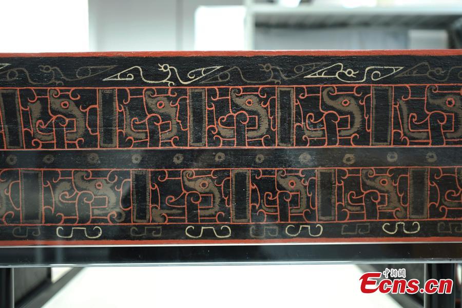 A close-up look at the elaborate patterns on a renovated lacquer wood bed from 2,500 years ago at the Chengdu Cultural Relics and Archeology Research Institute in Chengdu city, the capital of Southwest China’s Sichuan province, Jan 8, 2017. [Photo/China News Service]