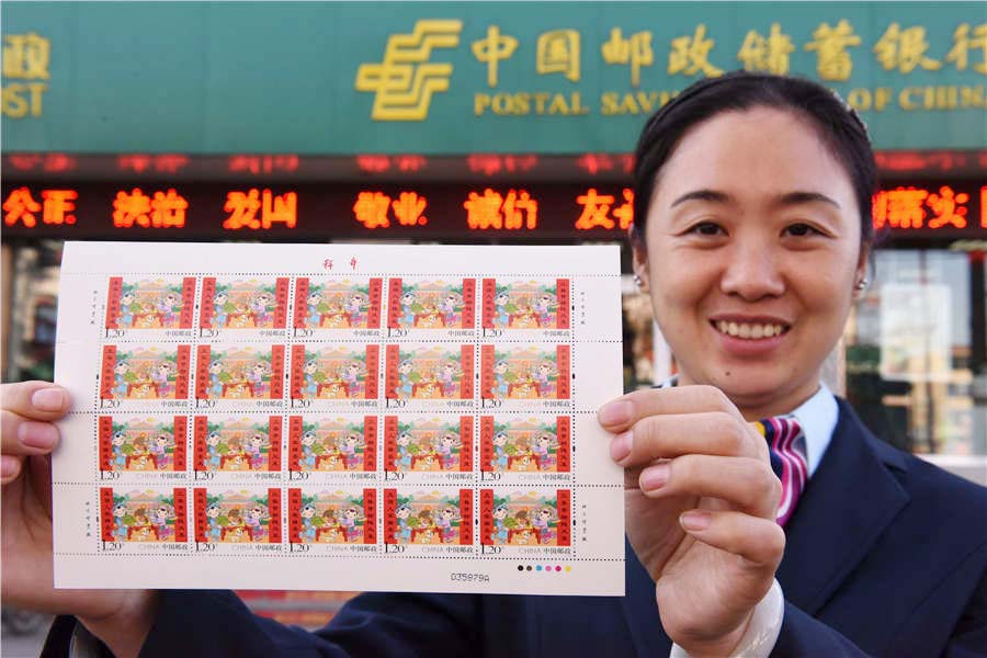 A post office staff member shows the newly issued "New Year Greetings" stamps in front of a post office in Xinle city, Hebei province, Jan 10, 2018. [Photo by Jia Minjie/Asianewsphoto]