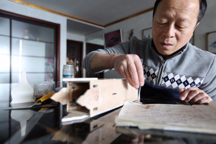 Ji Zhoutong makes miniature buildings in Qingdao,East China's Shandong province, Jan 14, 2018. Qingdao citizen Ji Zhoutong has been obsessed with making miniature buildings with shells for nearly 30 years. He made many miniatures of Qingdao's old buildings by decorating little pieces of shells on wooden main bodies.[Photo/Xinhua]