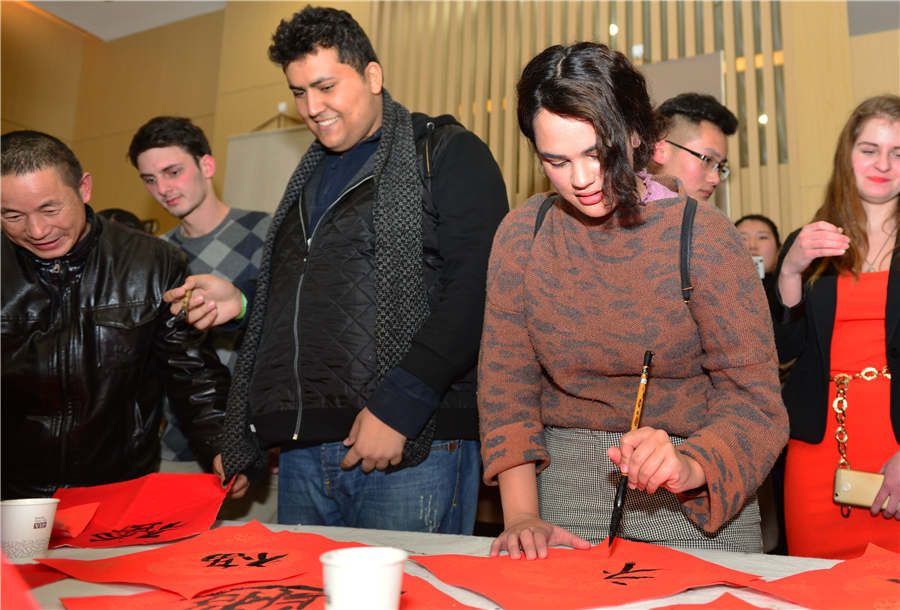 Naomi from New Zealand writes a Chinese character using a writing brush. [Photo by Ge Chuanhong/Asianewsphoto]