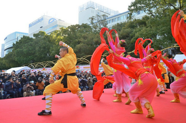The monks of the Shaolin Temple of the Culture and Art Troupe of Henan province demonstrate Shaolin kung fu at the opening ceremony of the 12th Nagoya Chinese Lunar New Year Celebration, Jan 6, 2018. [Photo/Chinaculture.org]