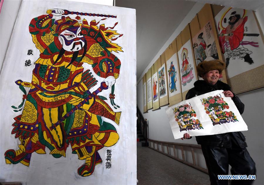 Folk artist Zhang Baode shows the newly-made woodblock New Year prints in Zhuxian township of Kaifeng city, Central China's Henan province, Jan 17, 2018. [Photo/Xinhua]