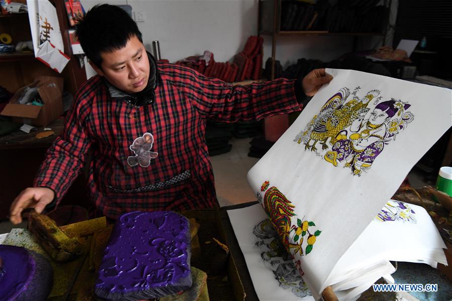 Folk artist Yin Entian prints woodblock New Year paintings in Zhuxian township of Kaifeng city, Central China's Henan province, Jan 17, 2018. [Photo/Xinhua]