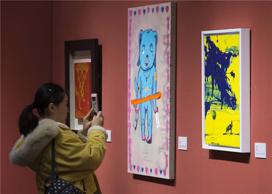 A visitor takes a photo of dog-themed paintings at the Jinling Art Museum in Nanjing city, Jiangsu province, Jan 18, 2018. [Photo by Su Yang/Asianewsphoto]