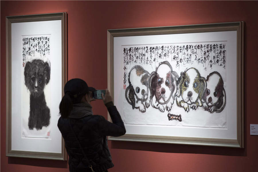A visitor takes a photo of dog-themed paintings at the Jinling Art Museum in Nanjing city, Jiangsu province, Jan 18, 2018. [Photo by Su Yang/Asianewsphoto]