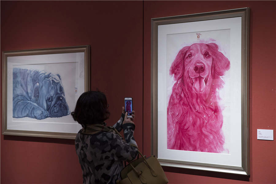 A visitor takes a photo of dog-themed paintings at the Jinling Art Museum in Nanjing city, Jiangsu province, Jan 18, 2018. [Photo by Su Yang/Asianewsphoto]