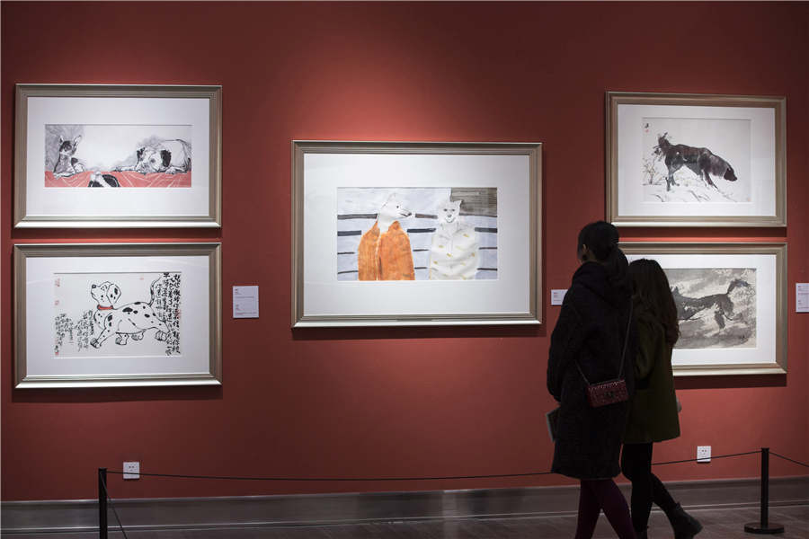 Visitors view dog-themed paintings at the Jinling Art Museum in Nanjing city, Jiangsu province, Jan 18, 2018. [Photo by Su Yang/Asianewsphoto]