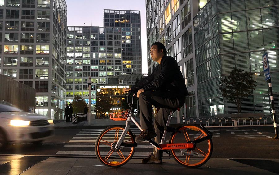 Sui rides a shared bike in the street. [PHOTO BY WANG JING/CHINA DAILY]