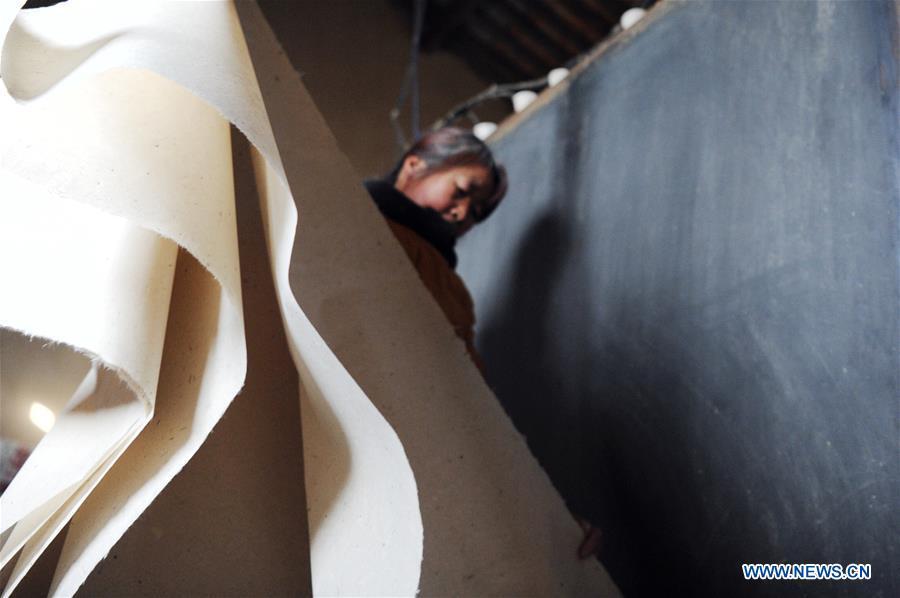 Papermaker Jiang Luyin takes the papers of Marquis Tshai that have just been dried in Qiliang village of Zhouzhi county in Xi'an city, Northwest China's Shaanxi province, Jan 19, 2018. [Photo/Xinhua]