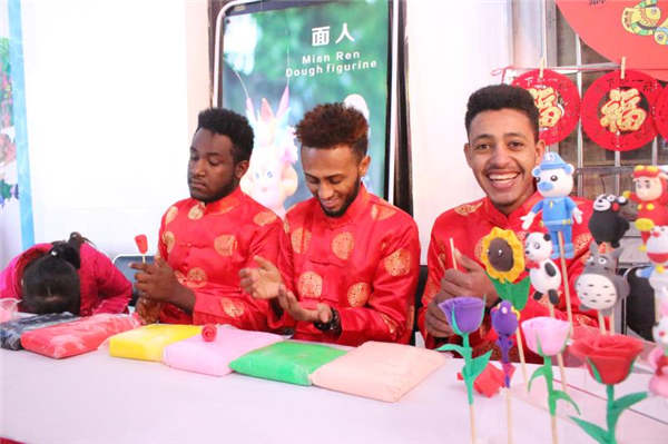 Foreign students learn to make dough figurines at a community in Furong district, Changsha city, Central China's Hunan province. [Photo by Li Meng/provided to chinadaily.com.cn] |