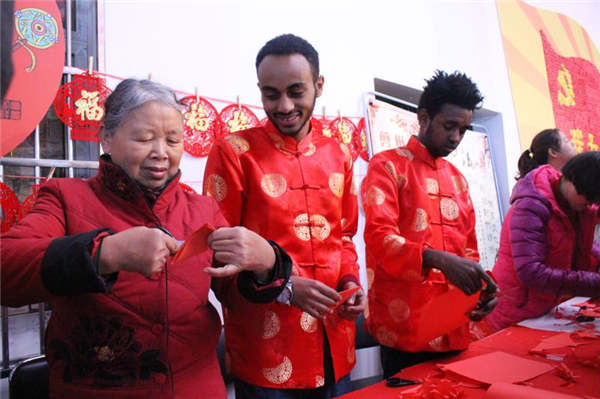 Foreign students learn paper-cutting at a community in Furong district, Changsha city, Central China's Hunan province. [Photo by Li Meng/provided to chinadaily.com.cn]