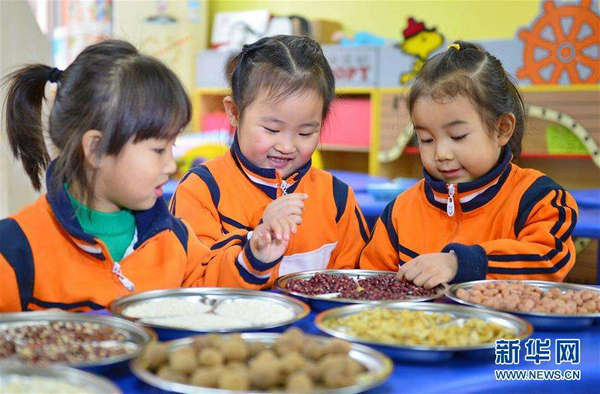 Three children look at the main ingredients of the Laba porridge. [Photo/Xinhua]