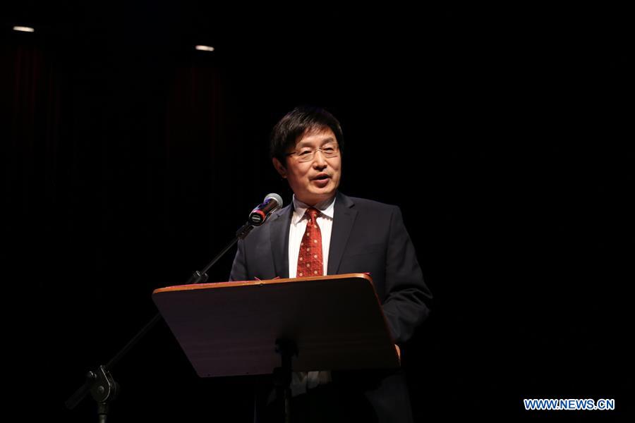 Chinese Ambassador to Cyprus Huang Xingyuan gives a speech before the performance of the "Happy Chinese New Year" event to celebrate the upcoming Chinese Lunar New Year in Limassol, Cyprus, Jan 24, 2018. [Photo/Xinhua]