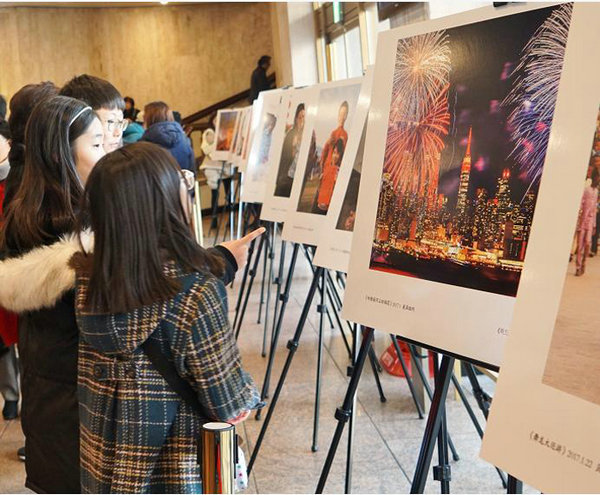 Visitors look at photos exhibited at the concert hall in Seoul on Jan 21, 2018. [Photo/Chinaculture.org]