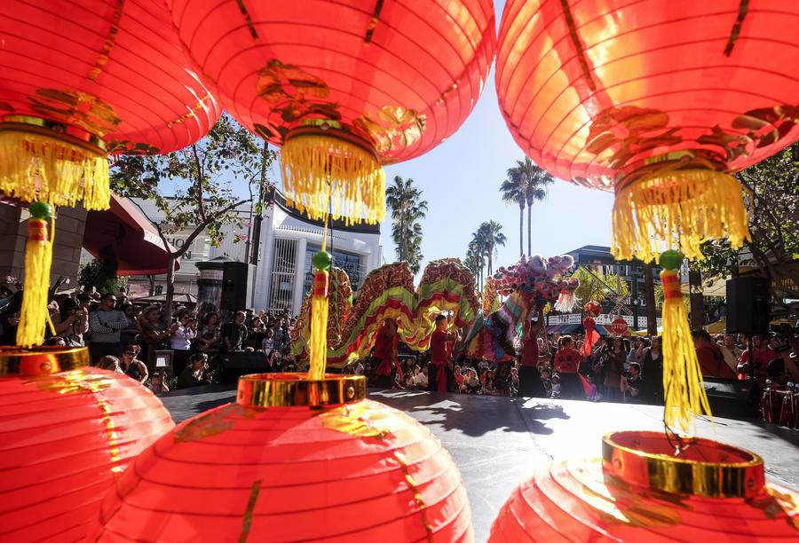 Dragon dancers perform during a celebration for Chinese lunar new year at the Original Farmers Market in Los Angeles, the United States, Jan 28, 2018. [Photo/Xinhua]