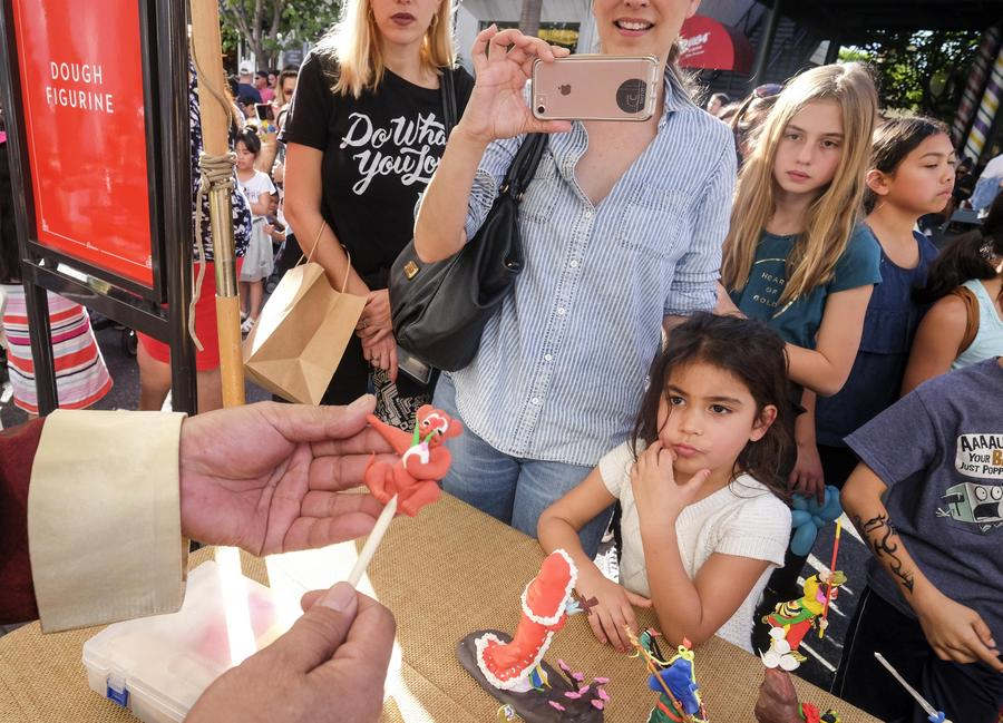A dough figurine artist makes an animal figurine during a celebration for Chinese lunar new year at the Original Farmers Market in Los Angeles, the United States, Jan 28, 2018. [Photo/Xinhua]
