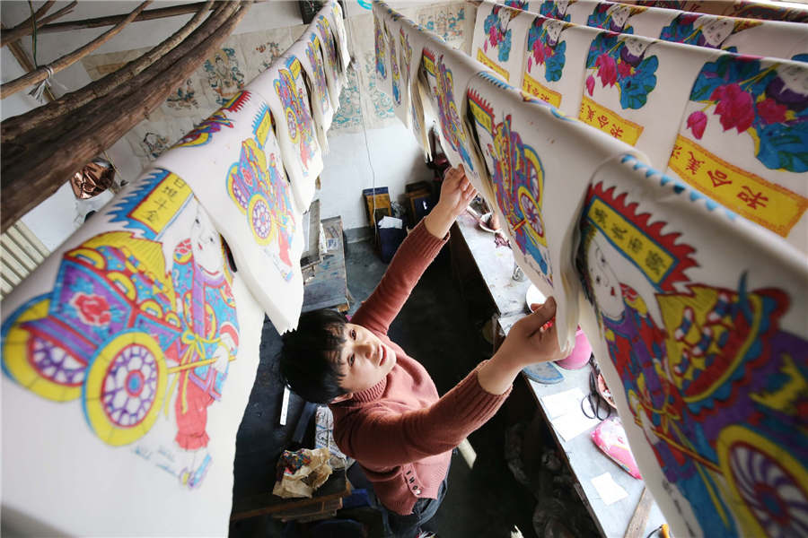 A folk artist dries New Year pictures off in Yangjiabu village of Hanting district in Weifang, East China's Shandong province, Jan 29, 2018, to cope with the demand of festival market. [Photo/Xinhua]
